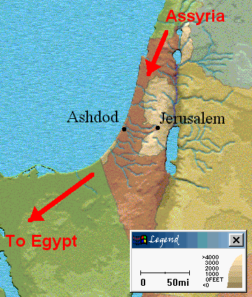 Sennacherib, would attack Judah (Is. 36-37).Ashdod ' a city 30 miles west of Jerusalem and three miles inland from the coast. It's name means "stronghold". It was an important city because it was on the main road from Egypt to Palestine. When Joshua had conquered the Promised Land, Ashdod was given to the tribe of Judah to conquer (Josh. 15:47). It was one of the five main cities of the Philistines. For 700 years, the tribe of Judah was unable to conquer it until the time of Hezekiah's grandfather, Uzziah. It had only belonged to Judah for about 50 years before the Assyrians attacked and captured it.